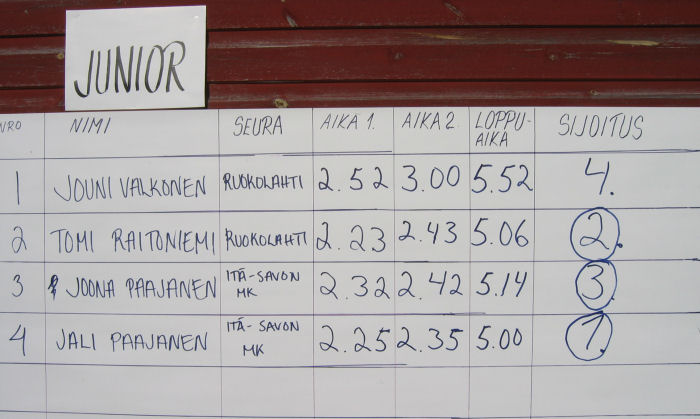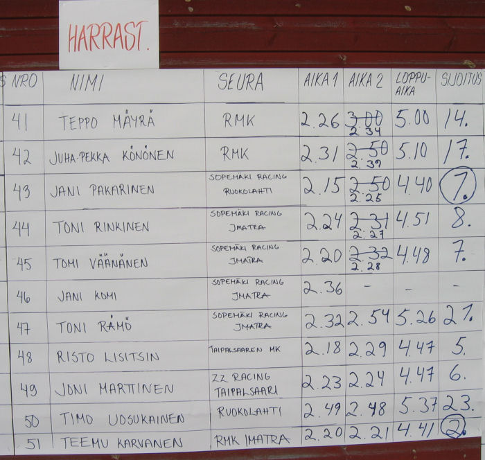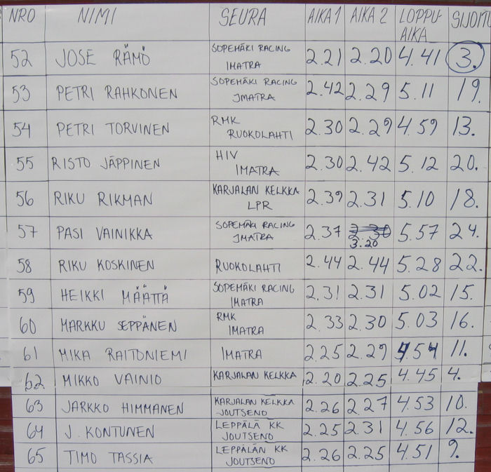 Harrastelijat 1. Jani Pakarinen, Sopemäki Racing Ruokolahti 2. Teemu Karvanen, RMK Imatra 3. Jose Rämö, Sopemäki Racing Imatra