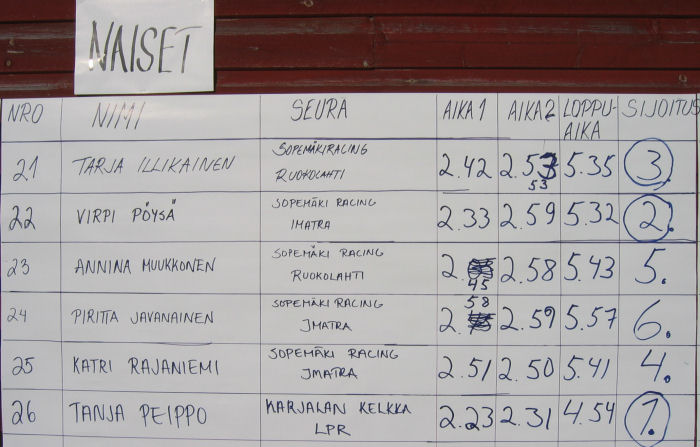 Ladyt 1. Tanja Peippo, Karjalan Kelkka Lappeenranta 2. Virpi Pöysä, Sopemäki Racing Imatra 3. Tarja Illikainen, Sopemäki Racing Ruokolahti