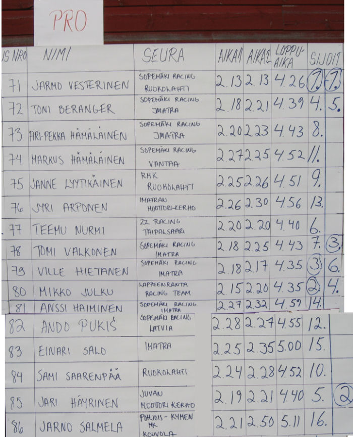 Pro 1. Jarmo Vesterinen, Sopemäki Racing Ruokolahti 2. Jari Häyrinen, Juvan moottorikerho 3. Tomi Valkonen, Sopemäki Racing Ruokolahti
