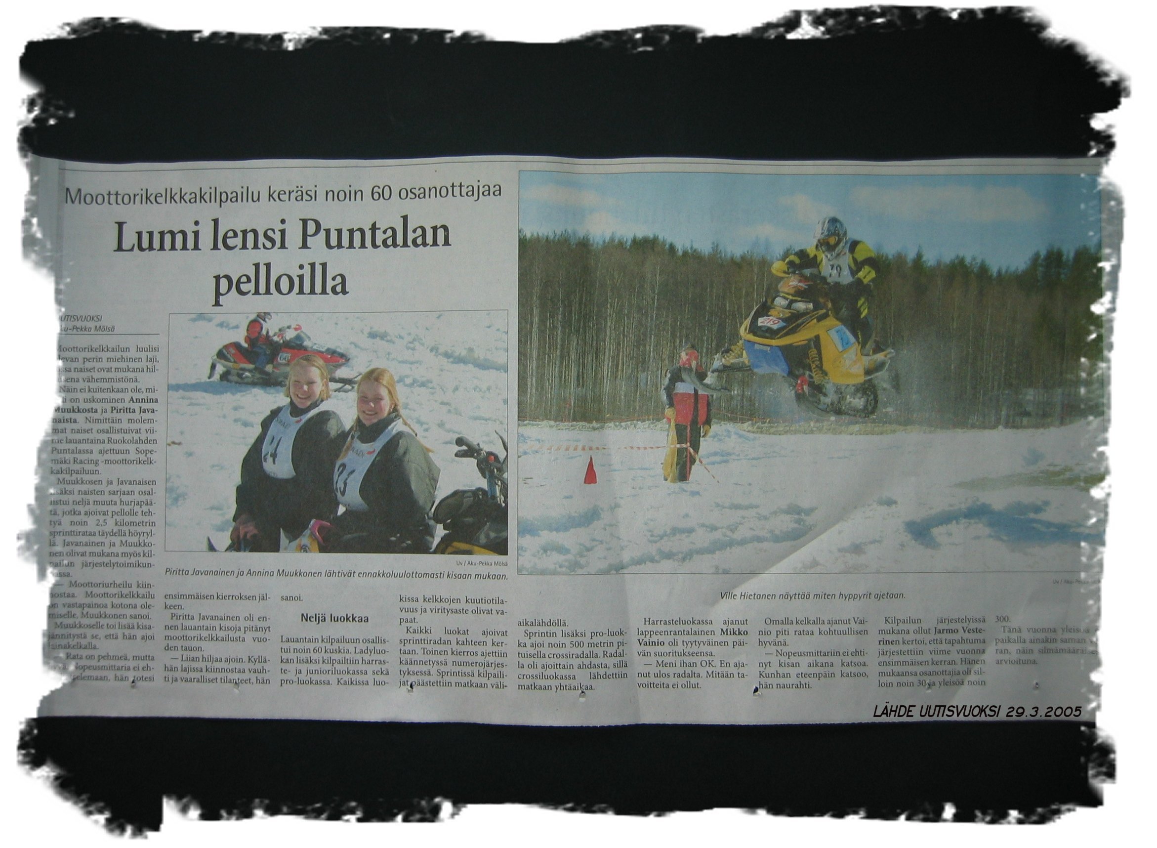 Kerimaan kansallinen Crossi 5.3.05 Jarmo Vesterinen osallistui Kerimaassa järjestettyyn kansalliseen snowcross- kilpailuun.Jarmon luokassa oli 10 kuljettajaa. Jarmo jäi lähdössä toiseksi viimeiseksi, mutta pystyi nousemaan jo neljänneksi, kunnes tekniikkamurheet pilasivat kilpailun ja edessä oli keskeyttäminen. Kuvia gallerian puolella...